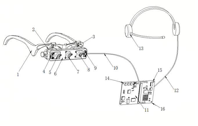 As the picture shows, 1-10 is the head-mounted sensor part. 4 and 9 are ultrasonic matrix radars. 5, 7, and 8 are three-dimensional depth-of-field cameras. 1, 2, 3 are head-mounted frames. 10 is a data connection line for transmitting data collected by the sensor to the SOC processor system. 11, 14, 15, 16 constitute the main control system of the guide equipment. Among them, ⑾ is a relay module, which controls the power supply of the system. 15 is a speech synthesis module, which is used for speech synthesis and recognition during natural language interaction. 16 is a ZYNQ system-on-chip, which is used for processing video stream data and ultrasonic matrix radar data. 14 is a nine-axis gyroscope for indoor positioning. 12 is a headphone cable, and 13 is a microphone.