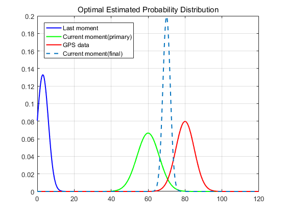 Let `N_0` be the distribution of position estimates obtained in the above estimation stage, `N_1` be the distribution of GPS positioning measurement data which is also Gaussian white noise distribution), and `N^'` be the final Kalman position estimation distribution. μ and σ represent their mean and variance.
