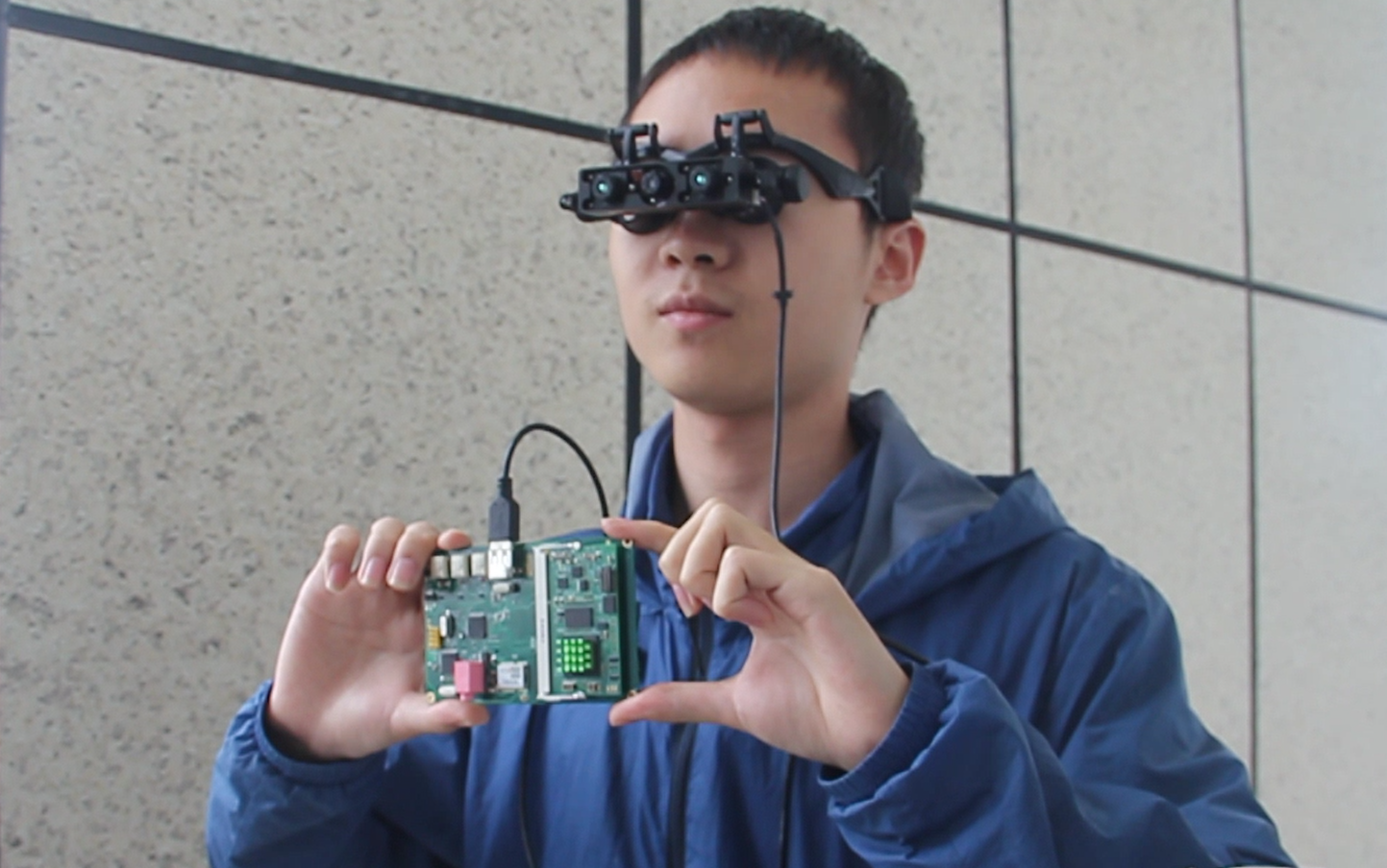 When the device is enabled, user positioning is performed first. GPS equipment and inertial navigation equipment work together to achieve precise positioning. After the positioning is completed, the device recognizes the user's voice instruction and calls the mapping software to perform optimal route planning. During the process, the SOC system analyzes the data transmitted by the lidar and camera, processes the surrounding environment information, performs real-time 3D modeling on the surrounding environment, and performs path planning in complex environments. Besides, the device will give real-time voice prompts to avoid obstacles.The final design of the device is shown below: