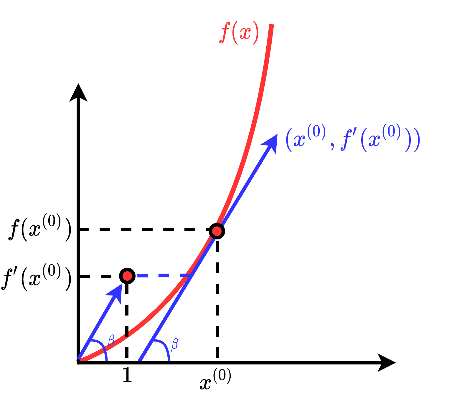 我们最终实际上会得到一个向量 $(1,f'(x))$,这个向量指定了当自变量取值为 $x^{(i)}$ 时,函数的增长方向向量 $(1,f'(x^{(i)}))$,如上图所示。这个增长方向向量也可以使用我们平时常说的 "斜率" 来表示,也即 $\tan\beta=\frac{f'(x^{(i)})}{1}=f'(x^{(i)})$,我们称这个 "斜率" 为 $f(x)$ 的 梯度 (Gradient) ,记为 $\nabla(x)=f'(x)$。梯度 $\nabla(x)$ 反映了自变量 $x$ 发生的微小变化给 $f(x)$ 带来的影响。