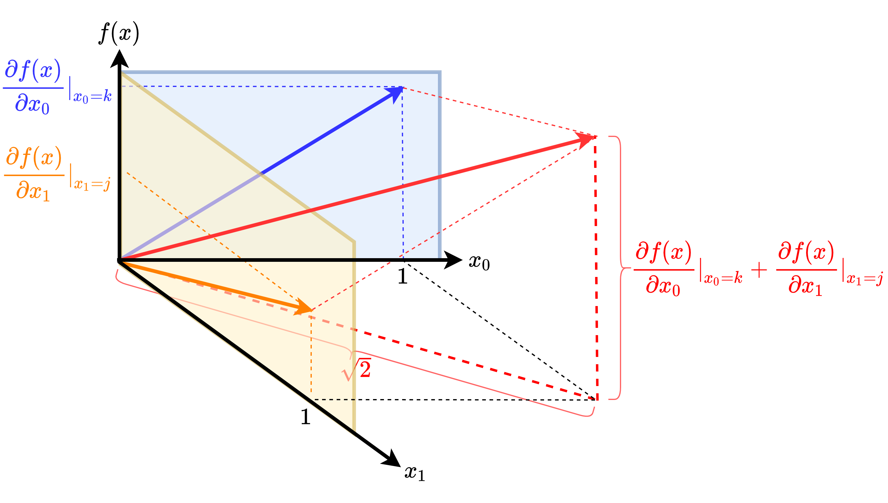 同样地,对于多维连续函数 $f(X)$ 来说,如果我们对其自变量 $X=[x_1,x_2,...,x_n]$ 求偏导数,我们会得到在各个方向上的 $f(X)$ 的增长方向向量 $(1,f'(x_1))$, $(1,f'(x_2))$, ..., $(1,f'(x_n))$。如上图所示,以二维的情况为例,若自变量在各个增长方向上的速率相同,则我们可以对各个增长方向向量进行合成,并求出总的梯度为