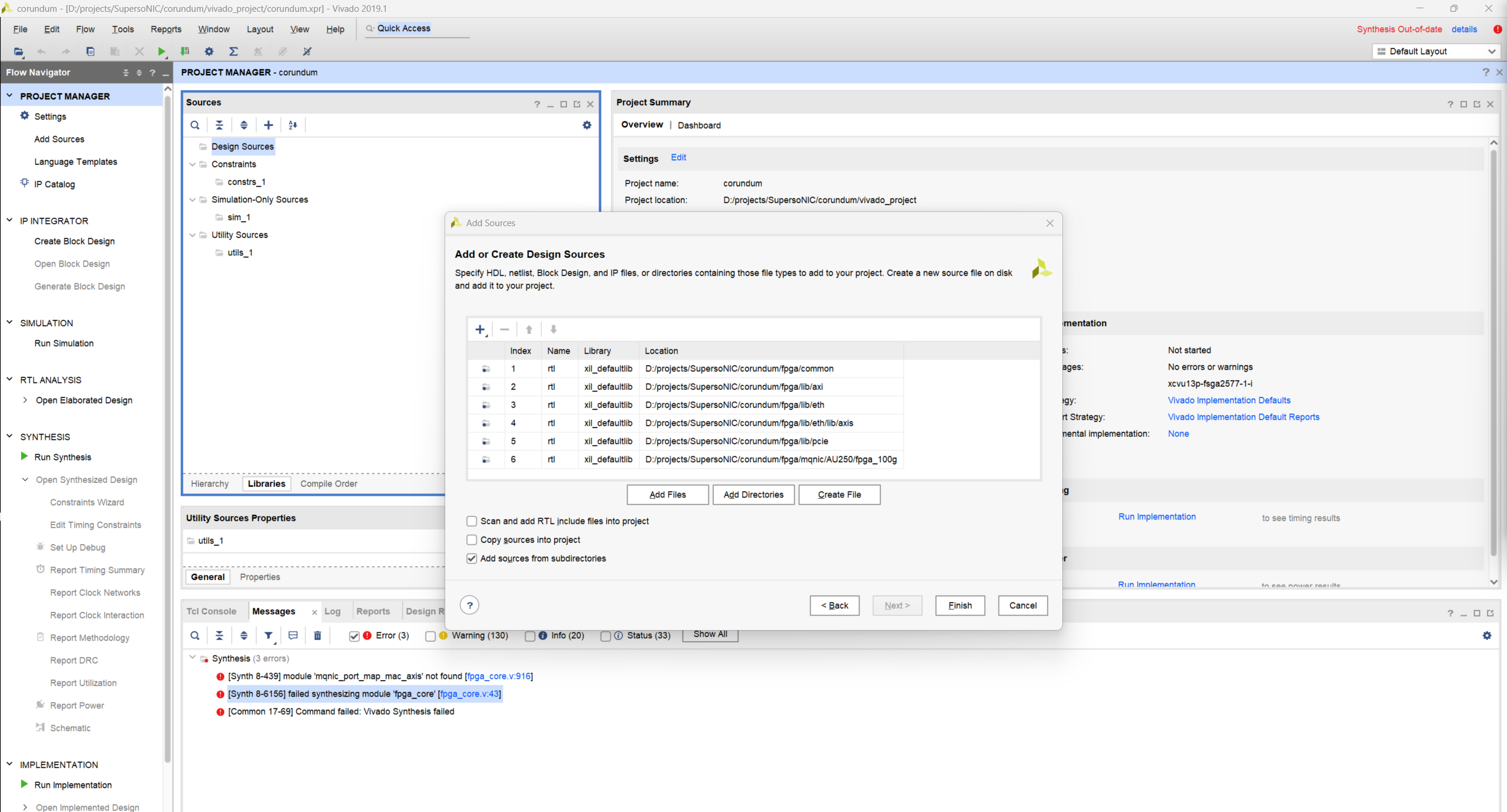 在完成 Vivado 的安装后,我们创建一个新的 Vivado project。从 Corundum 官方仓库 corundum_repo 拉取到代码后,需要加载到 Vivado project 的源文件有: