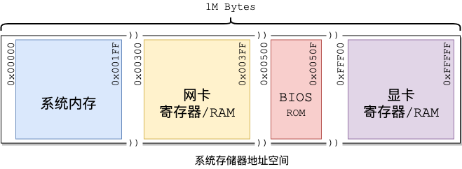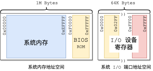 在早期的 Intel CPU 中,由于只有 20 条地址线,只能支持 `2^20` = 1M Bytes 的系统地址空间,系统内存本来就是紧缺的资源,如果还使用 MMIO 的方式,只会使系统内存部分的地址空间被严重耗尽。因此早期的 Intel CPU 使用了 PMIO 的方式。在 PMIO 方式下,I/O 设备上的寄存器被称作端口,CPU 将这些端口独立出来,在系统内存空间之外独立编址,如上图所示。这样一来,系统内存空间又变为在当时看来比较充裕的 1M Bytes。在这样的设计下,CPU 访问系统内存和访问 I/O 设备存储器使用的就是不同的指令,因为只有区分了指令,CPU 在运行指令的时候才能区分要向哪个地址空间发起读写访问。
