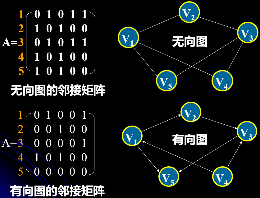 对于有向图来说,若 `a_(ij)` 为1,则表示存在从 `a_i` 出发到达 `a_j` 的一条弧。有向图顶点的出度为该行的元素之和,有向图顶点的入度为该列的元素之和。