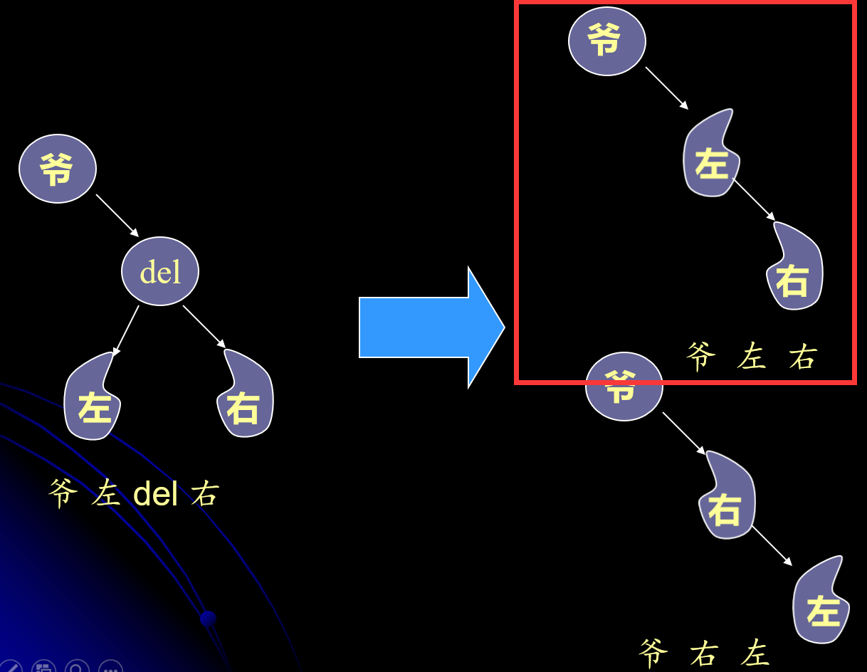 对于二叉树的删除,我们遵守的原则是保证删除后二叉树的结点遍历顺序与删除前保持不变。以上图为例,倘若我们按照中序遍历的顺序,在删除之前,遍历顺序是 爷 左 del 右,我们在删除爷结点右子树的根,即del结点后,为了保证遍历顺序是 爷 左 右,则必须把从del上“剪”下来的左子保证树 `T_L` 挂在爷结点的右子树位置,把从del上“剪”下来的右子树 `T_R` 挂在 `T_L` 的右子树位置。类比,如果删除的位置是爷结点的左子树根节点del的话,则必须把从del上“剪”下来的右子树 `T_R` 挂在爷结点的左子树位置,把从del上“剪”下来的左子树 `T_L` 挂在 `T_R` 的左子树位置,才能保证删除后二叉树的结点遍历顺序与删除前保持不变。
