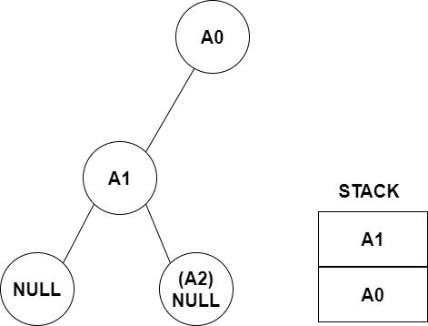 实际上,如上图所示,根据上面的5个步骤,若结点 `A_1` 的左子树为空,结点 `A_1` 就会作为栈顶元素会被 ①出栈 并 ②访问,随后就会 ③前往结点 `A_1` 的右子树。而当结点 `A_1` 的右子树也为空时(即 `A_2` 不存在时),实际上对以 `A_1` 为根节点的子树的访问已经结束,需要回溯到 `A_1` 的父节点 `A_0`。结点 `A_1` 出栈后,此时栈中的栈顶实际上就变成了 `A_1` 的右子树根节点 `A_2` 的爷结点 `A_0`,因此接下来的操作是将栈顶元素(此时是 `A_0` )①出栈 ②访问 ③前往右子树三步。此时我们发现规律,只要结点的左子树或者右子树不存在,对栈的操作都是 ①出栈 ②访问 ③前往右子树 三步,因此我们可以将上面的 STEP 3 和 STEP 5合并,变成: