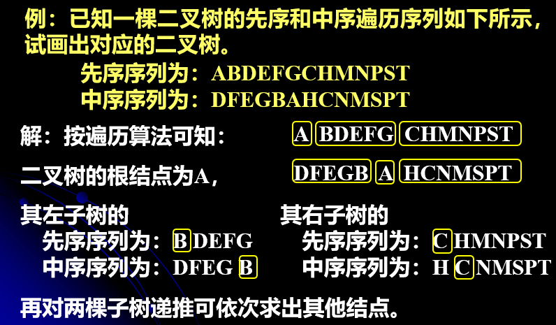 在没有使用空格标明空孩子的情况下,我们无法根据单一序列来重构二叉树。只有在给出 先序遍历序列&中序遍历序列 或 后序遍历序列&中序遍历序列 的情况下(总之一定要有中序序列),我们才可以对一个二叉树进行重构。具体例子如下所示: