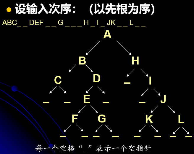 以上图为例,我们输入一串序列,其中用“_”(空格)代表空元素。下面以先序为例,列出二叉树具体构造方法:
