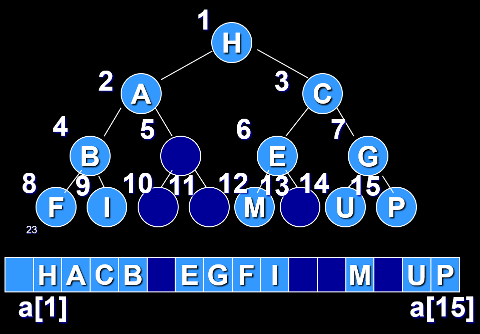 (a) 顺序存储结构:所有结点依次存放在一块连续的内存空间中,将完全二叉树从上到下,从左到右编号后,结点号码可作为数组的下标,从而将完全二叉树顺序存储下来。基于上面讨论的性质(e),当给出任意结点 `i`,则可知道它的父结点为 `[i/2]`,两个孩子分别为 `2i` 和 `2i+1` (如果存在的话)。一般的二叉树相对于同样深度的完全二叉树,缺失了部分结点,在顺序存储时,这些位置要空出来。以维持结点编号之间的父子换算关系。顺序存储结构只适合存满二叉树和完全二叉树,对其他树的存储将会造成空间的浪费。具体的实现方法是用一维数组来实现。